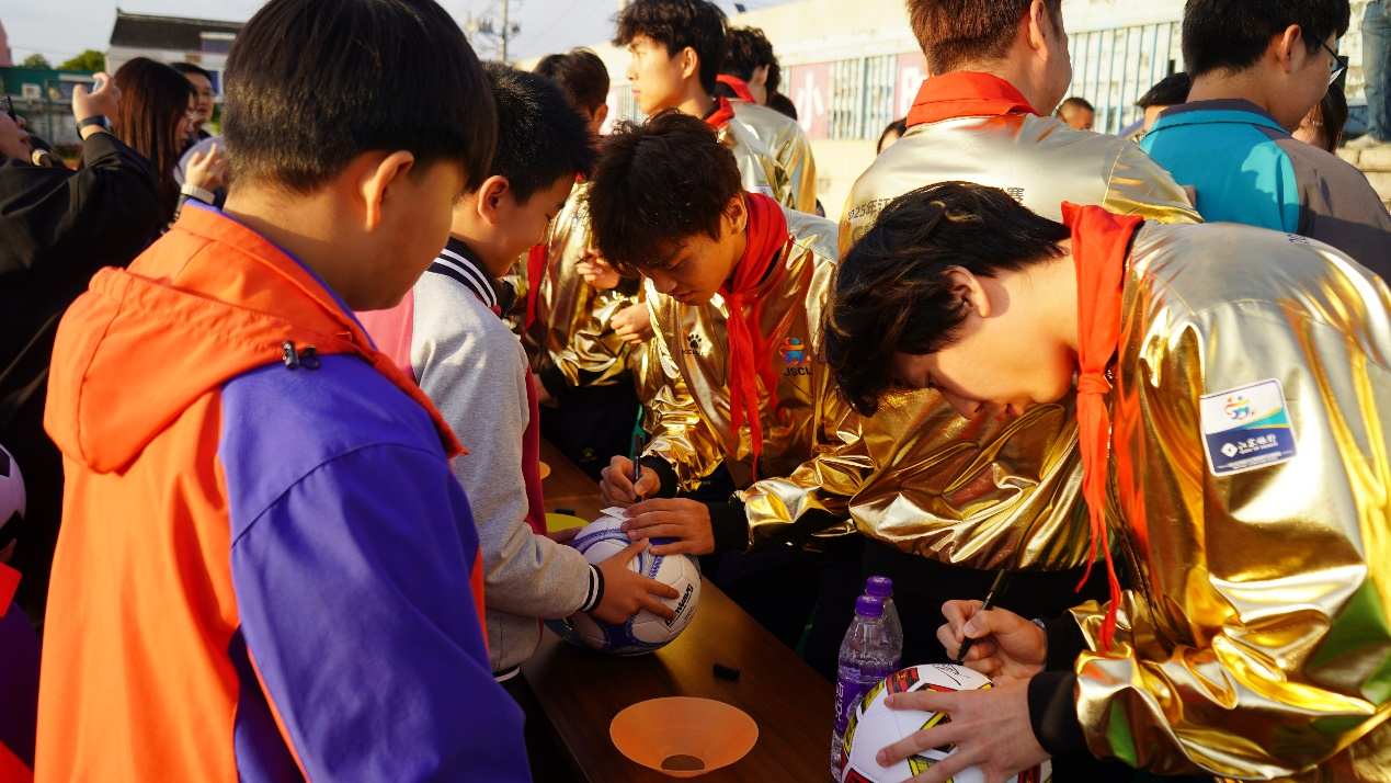 互动环节结束后,意犹未尽的小球迷们纷纷拿出早已准备好的足球、球衣、照片和笔记本,围拢在队员们身边,签名留念。队员们耐心地满足每一位小球迷的愿望,用笔尖定格下这段难忘的绿茵时光。