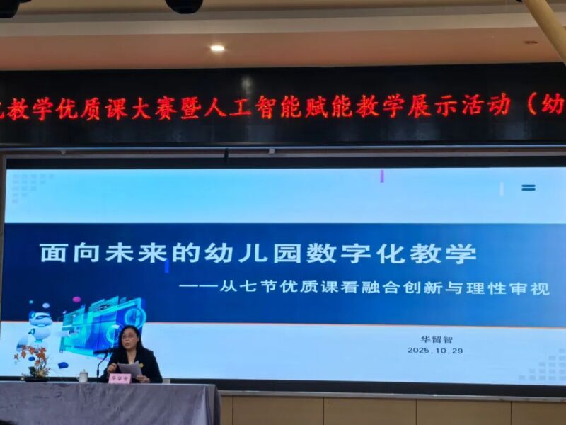 泰州市特级教师、泰州市姜堰区三水幼儿园园长华留智基于七节优质示范课例,开设了题为《面向未来的幼儿园数字化教学》的专题讲座。华留智从融合创新与理性思辨的双重视角出发,系统剖析了技术融合在幼儿园的教学路径与实践逻辑。她充分肯定了每节课在数字化应用方面的亮点,并进一步指出,在人工智能日益发展的教育背景下,幼教人应具备科学的教育观与技术整合能力,将教学智慧融入技术实践,为一线教师探索未来教育形态指明了清晰而务实的发展方向。