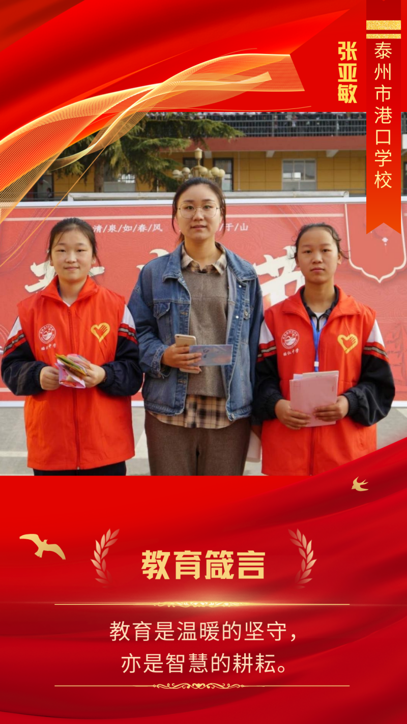张亚敏,女,29岁,籍贯江苏泰州,现任泰州市港口学校德育处副主任、初中数学教研组长,曾获评泰州市班主任基本功一等奖、初中数学基本功二等奖、泰州市及咸阳市优秀扶贫协作专业技术人员、《时代学习报》初中数学文化节优秀指导教师等荣誉称号。