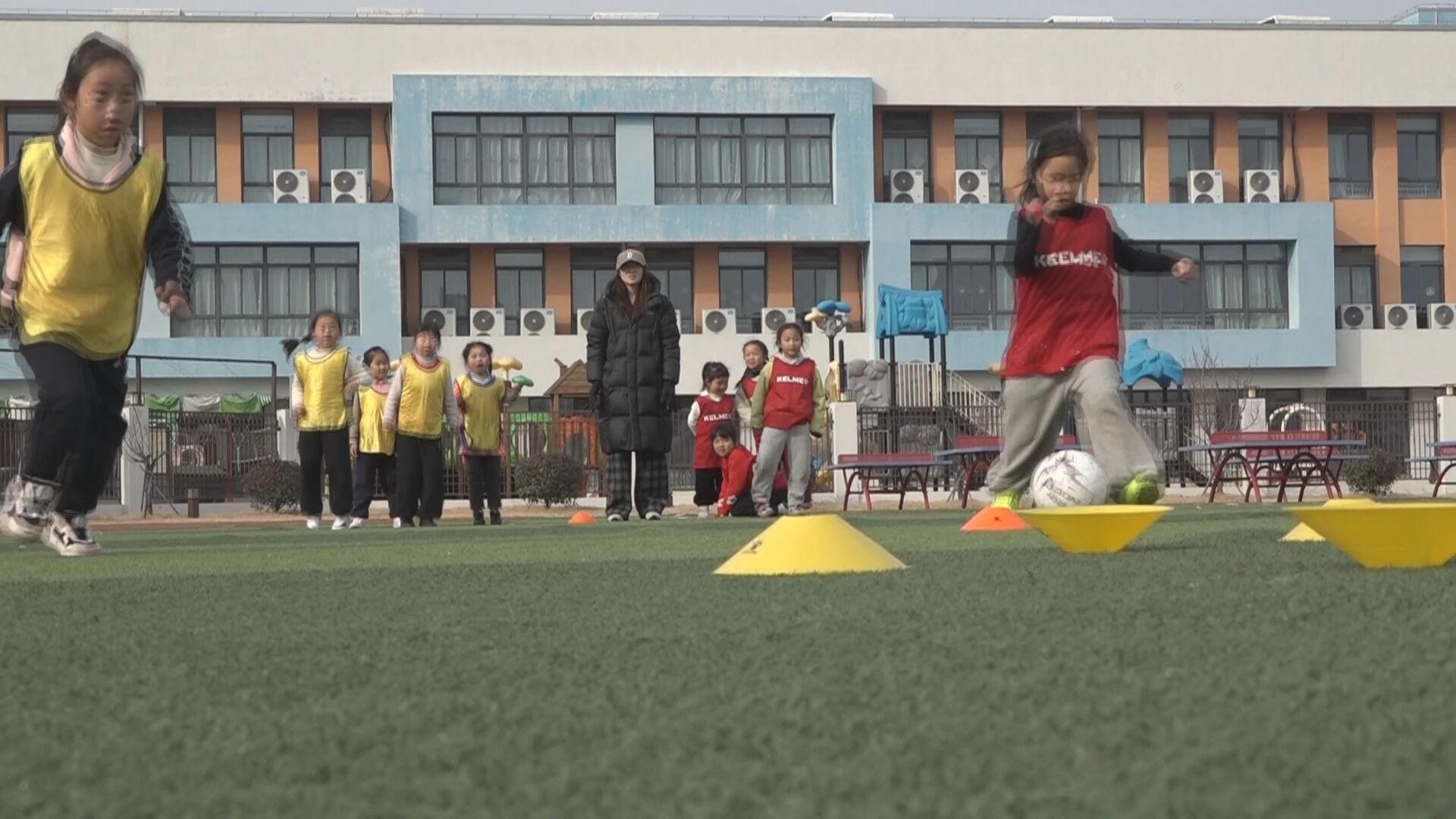 如何才能让“以体育人”的理念惠及更多孩子?黄平代表走进了调研的第二站——泰州市姜堰区新桥幼儿园。在这里,参加足球冬令营足球小将班的孩子们正在接受启蒙训练。园长周晓慧介绍,泰州去年赢得首届江苏省城市足球赛冠军,在当地掀起了足球热,幼儿园也顺势办起了足球小将班。“把苏超精神和足球文化引进我们幼儿园,以培养兴趣为主,让孩子们在玩中学、学中玩。”