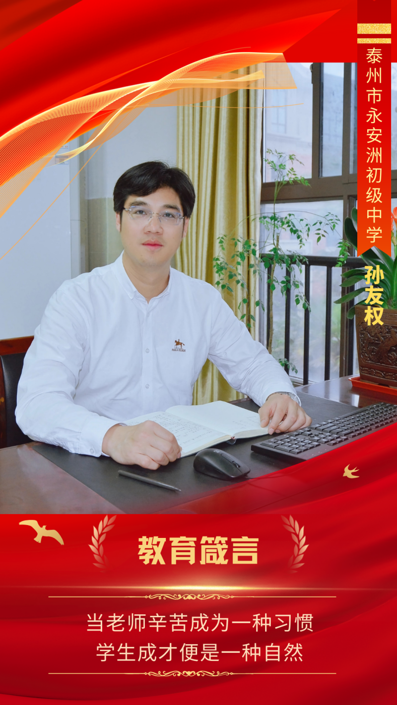 孙友权,中共党员,现任泰州市永安洲初级中学党支部书记、校长。担任泰州市初中数学名师团队领衔人,曾获江苏省青年教师优质课一等奖,泰州市先进工作者、“春蚕奖”等荣誉。开设省市级公开课、讲座30余次,主持多项省、市级重点课题,在核心刊物《数学通报》等发表高水平论文近30篇,4篇被人大复印全文转载。