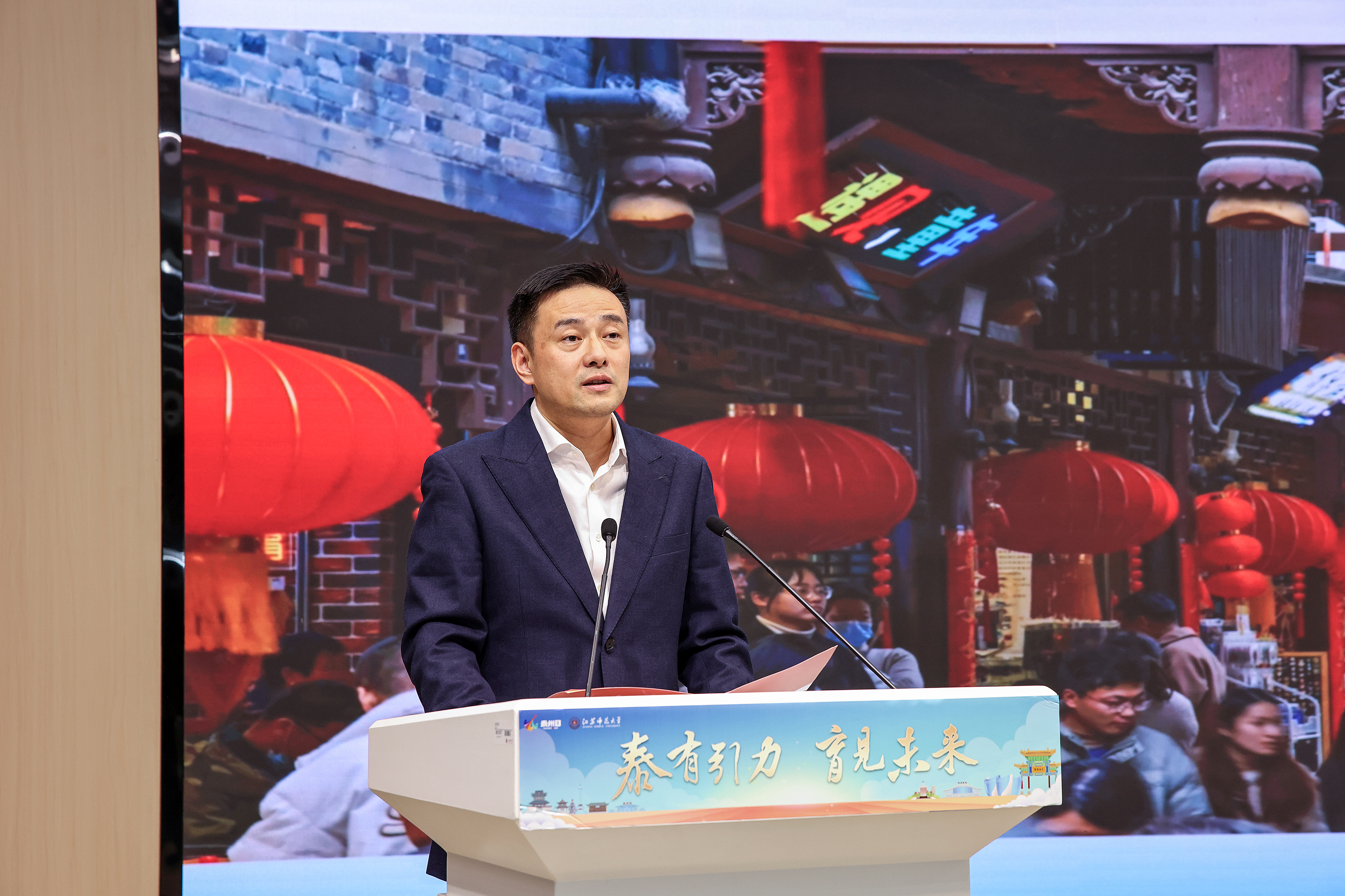 泰州市人民政府副秘书长张鹏致辞,介绍泰州产业结构、生活环境、文化底蕴和教育发展情况,诚邀江师大学子选择泰州、走进泰州、拥抱泰州、扎根泰州。