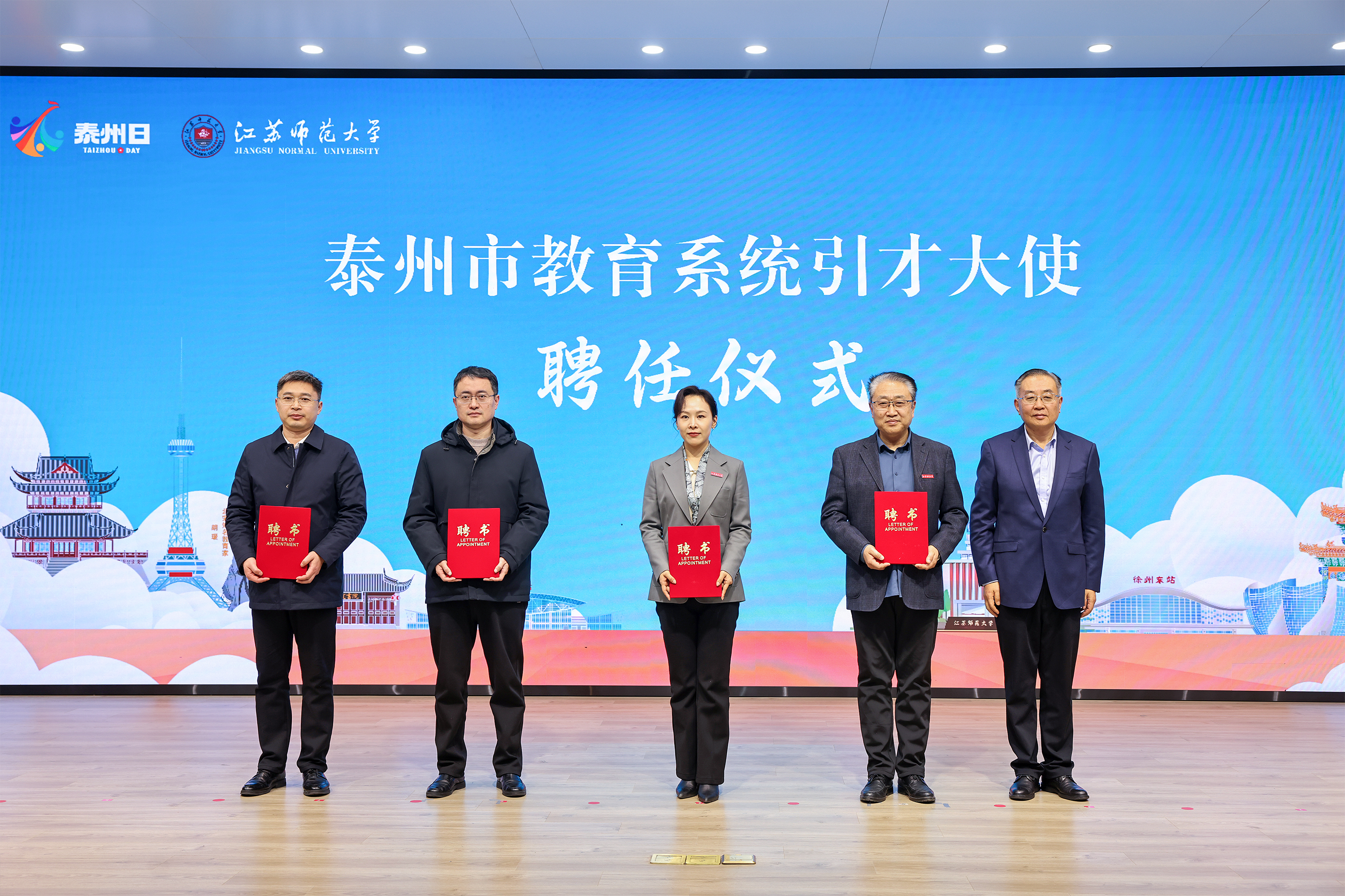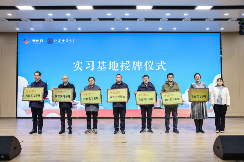 泰州市委教育工委书记、市教育局局长万永良颁发“泰州市教育系统引才大使”聘书;江苏师范大学教务处副处长梁靓为大学生教育实习基地学校授牌;靖江市教育局与江师大签订教育合作框架协议;与会领导共同启动教育系统“泰州日”走进江师大活动。