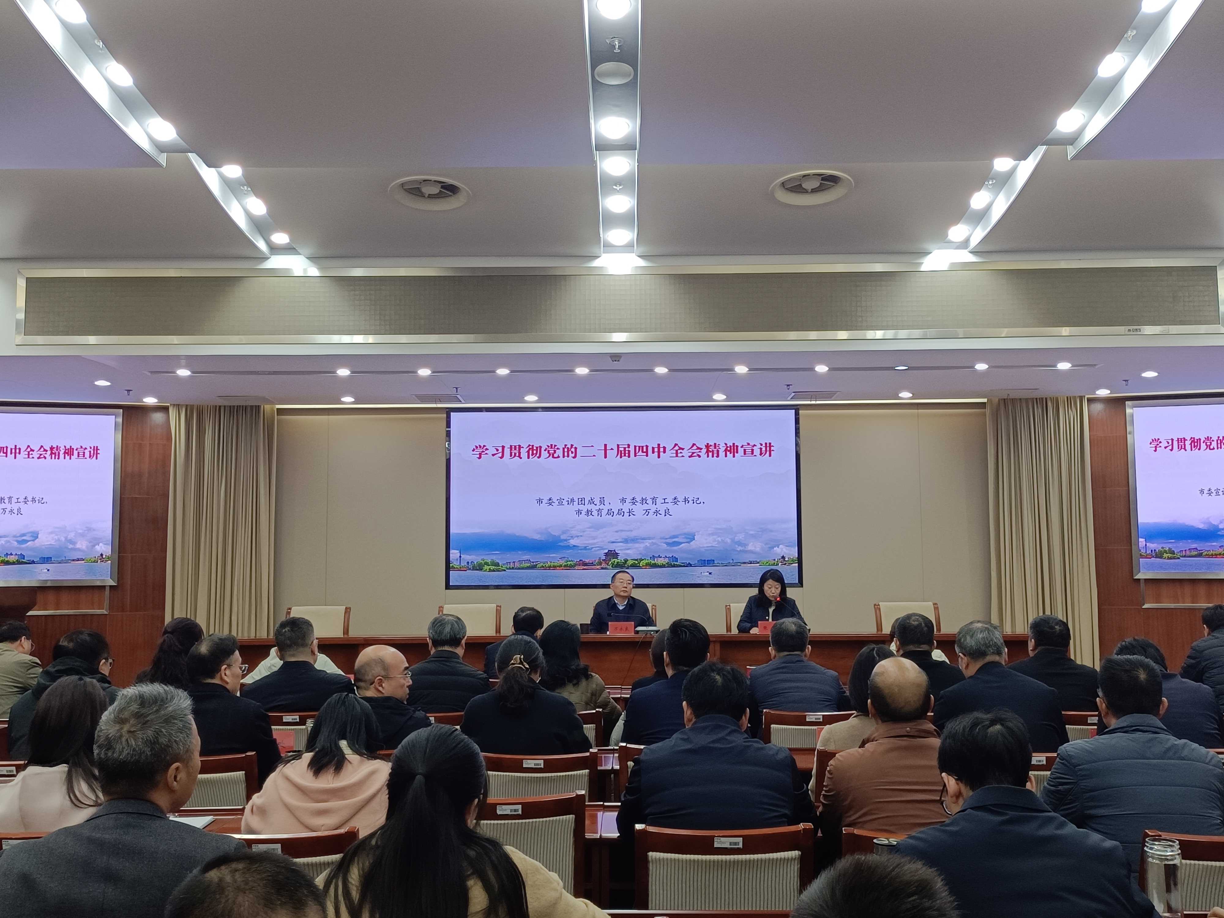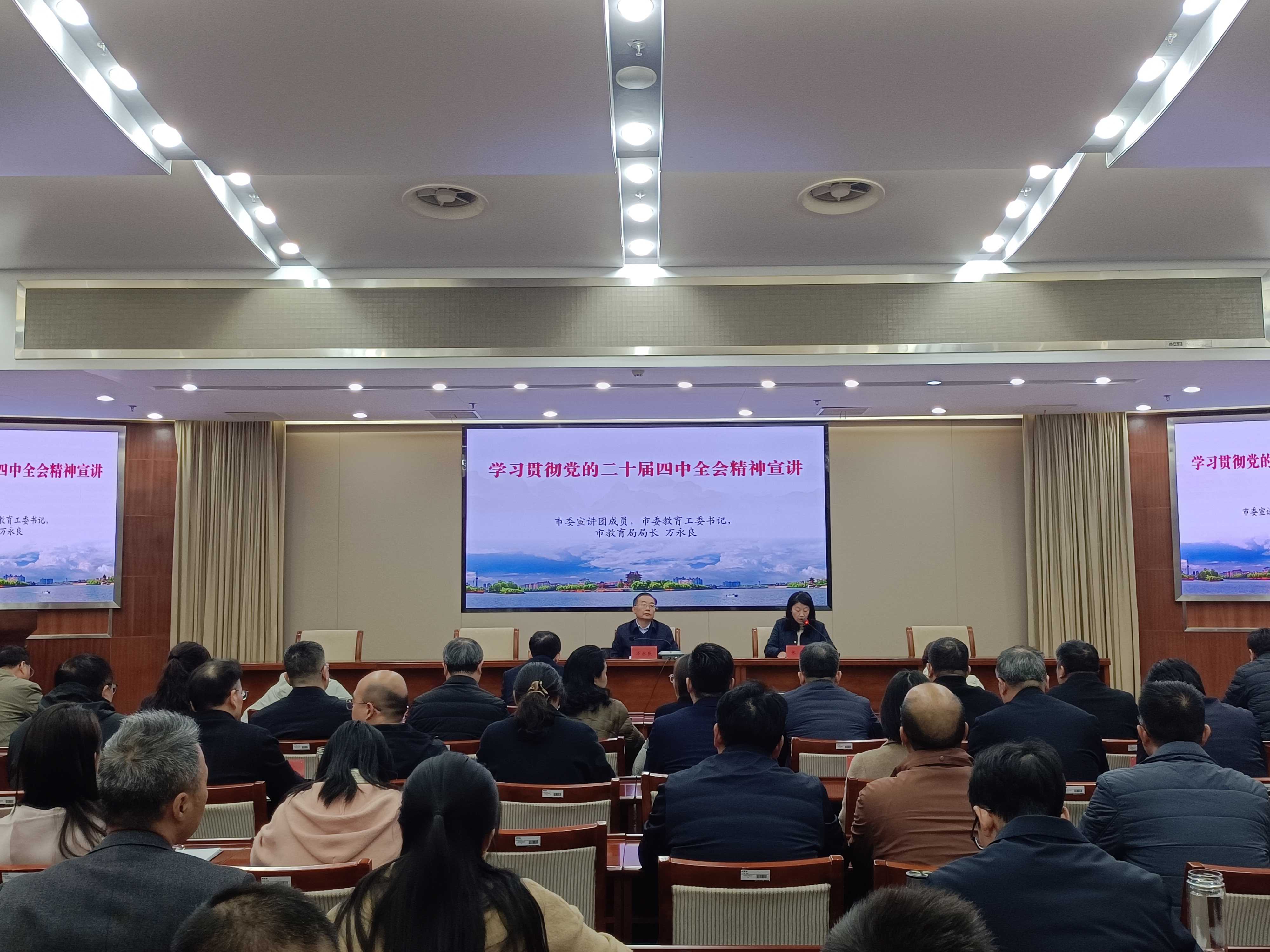 根据市委统一安排,12月2日下午,学习贯彻党的二十届四中全会精神市委宣讲团报告会(教育系统专场)在市教育局举行。市委宣讲团成员,市委教育工委书记,市教育局局长万永良作宣讲报告。市委教育工委副书记张晶主持并讲话。