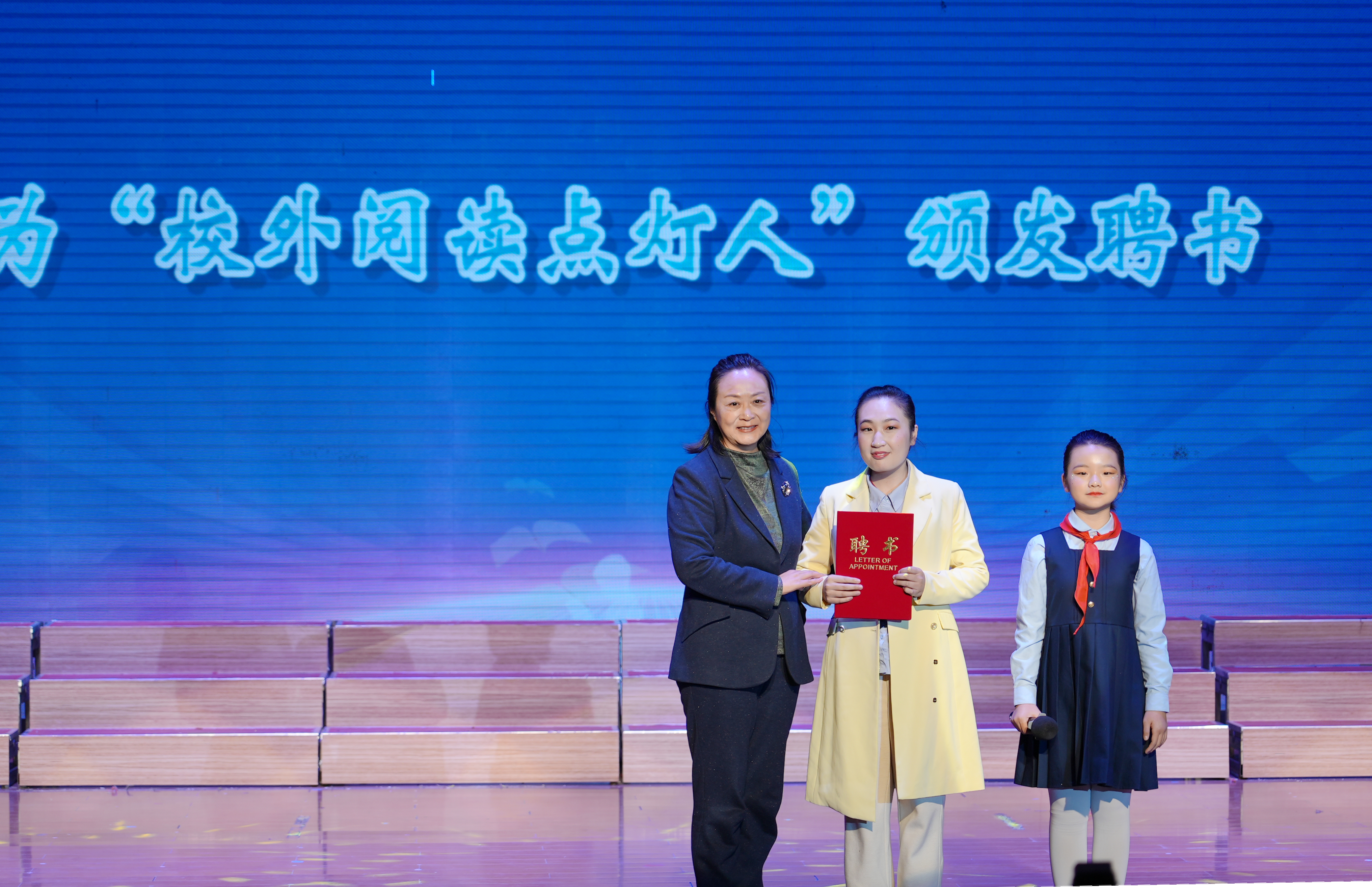 张洁为高梓涵颁发“校外阅读点灯人”聘书