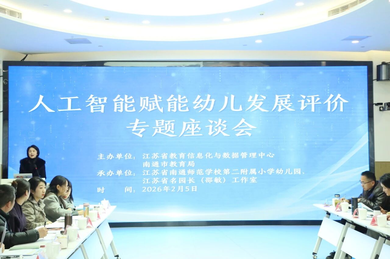 为落实“人工智能+”行动部署,探索人工智能在幼儿观察与评价领域的创新应用,2月5日,全省“人工智能赋能幼儿发展评价专题座谈会”在南通师范学校第二附属小学幼儿园滨江园区顺利召开。本次会议由江苏省教育信息化与数据管理中心主办,全省多地教育信息化部门负责人、高校专家、幼儿园园长与教师代表齐聚一堂,共话人工智能与学前教育的深度融合,为区域学前教育高质量发展凝聚智慧力量。