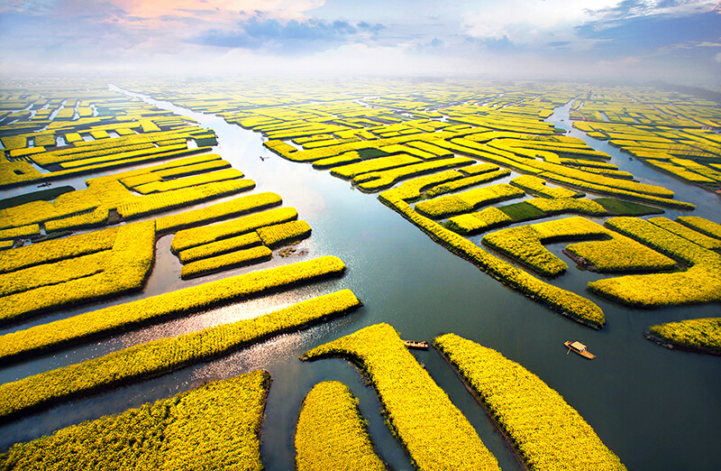 每年春天,兴化千垛景区迎来最美的时刻。金黄色的油菜花盛开于垛田之上,似无数个金色小岛漂浮于水中。满眼的金黄一直延伸到天际,勾勒出“河有万湾多碧水,田无一垛不黄花”的绮丽美景。坐上船娘划的扁舟,穿行于菜花垛田间,如在画中游。从高处观景塔看垛田,花似海洋的胜景使人不由地升腾起万丈豪情。千垛花海,与法国薰衣草庄园、荷兰郁金香花海、京都樱花并称全球四大花海。