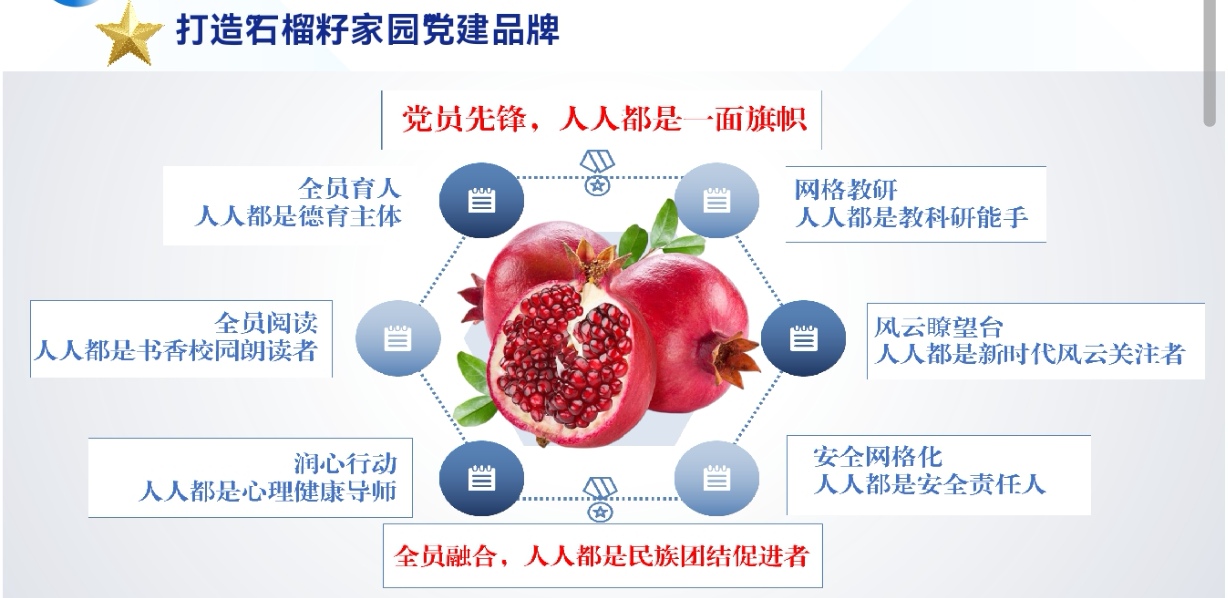 制度联动促规范。制定《“石榴籽家园”党建品牌建设实施方案》《党建与业务融合考核细则》,将“八个人人”要求细化为具体指标,与党员评优、教师绩效、职称评定挂钩,确保品牌建设落地见效。
