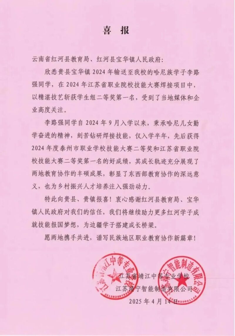 从去年险些“无学可上”的大山少年,到如今站上世界级赛事领奖台,李路强的“逆袭”,正是省靖江中专校深化东西部教育协作、助力乡村技能人才培养的生动写照。