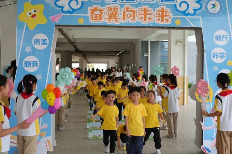 在欢快的音乐声中,一年级新生手牵手,依次跨过“成长阶梯”,穿过寓意深远的“启智门”。