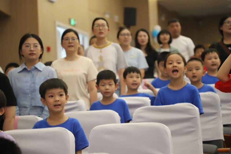 全体师生与家长肃立齐唱国歌。孩子们目光专注、歌声清澈,充分表达出对祖国的热爱与敬意。